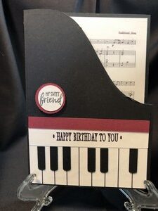 I made this card with both the friend notation and blank on the front. I used music sheet paper that is the Happy Birthday song on the inside and made the card shaped like a piano. There is an area at the bottom to write your own personal message.