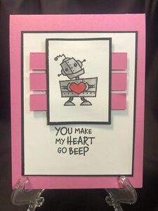 Just starting to make some Valentine cards and this stamp set just screamed out to me to be Valentine cards. This cute little robot is holding a heart which was colored with red copic markers. The body of the robot was also colored with copic gray markers. I added three strips of pink paper and […]