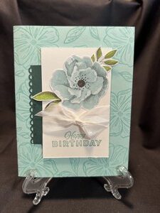 For these two cards I used the same scrapbook paper and cut out some more flowers. I first stamped the card stock with a flower outline. Next I stamped Happy Birthday on a small white card stock and then adhered a flower and some leaves to the white card stock. I added a small green […]