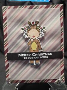 This card would be great for any little girl. I love how she looks so innocent in her reindeer clothes. I first added striped card stock onto a white card base and then stamped and colored the reindeer girl. I added some sparkle to the lights on her head. A layer of vellum was added […]