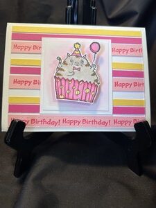 Nice card for a girly, it has pink, yellow, and white stripes for the background and to add a little fun the cat wobbles back and forth on a little spring. When you touch the cat in a cupcake it will move back and forth, hence wobble. I stamped Happy Birthday on the light pink […]