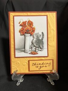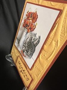 For my next card I made a thinking of you, which could be used as a comforting card or one of someone you just wanted to know you are thinking of them.  I used golds and browns for this one. For the side views I am trying to show how much 3D is one each card. I also embossed the backgrounds on both of the cards.