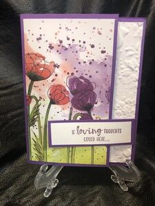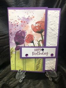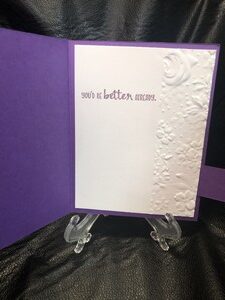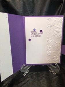 I used dark purple for the card base and I embossed part of the inside of the white card stock with a floral design .