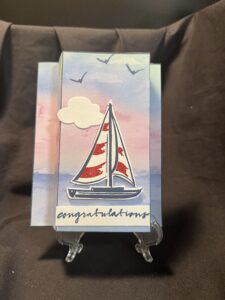 I popped up the sailboat to give it a little dimension. I love the sailboat and the water. I stamped the sailboat and the sea gulls and die cut the clouds. I made the front pop out but the inside is still flat to write a message to the recipient.