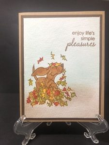 I love the smell of fall leaves and the briskness of the air. This card reminds me of this season. I used watercolor paper and water colors to color the leaves and the dog.