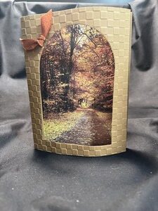 These cards were made to look like you are looking through a tunnel to the beautiful fall colors. I first embossed the paper then cut the oval out and mounted it on the front. I used some Fall paper for the window and the inside I added a sentiment that would be perfect for Thanksgiving.