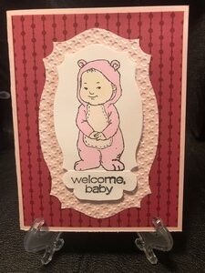I used the same dies to cut the shapes and the same designer paper. I used pink and blue copic markers to color in the baby and I used an embossing folder for a little texture. I then popped the baby up on dimensionals.