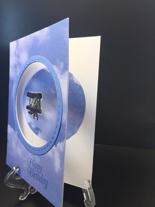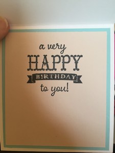 Anyone for a big fat birthday cake? I made this card thinking someone would love a big fat cake. I added some dimension to the candle on the cake. The first layer of the card is white base and then blue cardstock and finally a light pink. The sentiment on the inside says “A very happy birthday to you.”