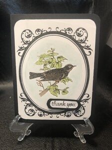 I’m not sure what kind of bird this is but I thought it was like a crackle. I loved the frame it is so old timey. I just added a little color to the bird and leaves and then did a wash around the bird with blue ink. This card could be used in so many ways just by changing the sentiment, for my card I used the sentiment thank you.