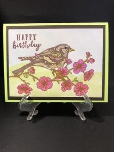 This card could be for any age for a birthday and is quite simple to make. I used copic markers for most of it and a little bit of wink a stella to give it a little sparkle. I stamped the bird and blossoms with brown memento ink so that the color would not be so harsh.