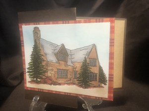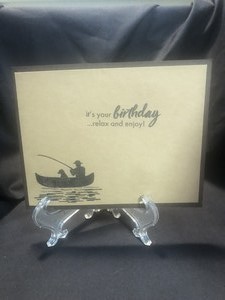 Although this stamp was a winter scene I changed the roof top to be one of those tin roofs and colored everything to look like a summer day. I used rustic colors and patterned plaid paper for the feel of an old cabin. The inside is stamped with a silhouette of a man and his dog on a boat. The sentiment says,”It’s your birthday relax and enjoy.”