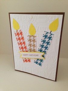 Birthday candle cardI used an embossing folder for the background with different words for birthday.  Quick, simple and sure to bring a smile to anyone’s face.