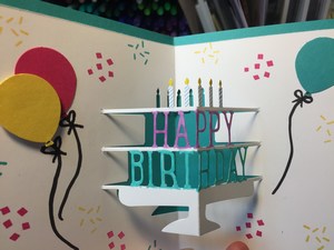 They are both using the same die on the inside but the look is so different. My sister gets the pink cupcake and my son received the balloon sign. Both of these cards are from using the new Stampin Up die which I fell in love with as soon as I saw it. It makes the card into a WOW card when the recipient opens it.