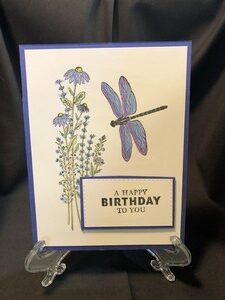 For this card I wanted to use lots of blue. The dragonflies where I live have a lot of blue and green on them. You can’t tell from the picture but the wings have a shimmer paint on them.