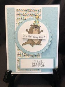 I added some designer paper for the little guy to balance on and cut out a scallop circle. I then popped up the circle with dimensionals. I stamped It’s birthday time and attached it to the center of the otter and added a little party hat on his head.