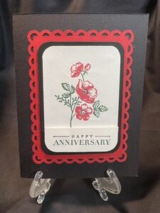 I first started out by die cutting a rectangle scalloped frame in red. I then stamped the flower and added some shimmer to the flowers using wink a stella. To make the flower pop I added a black frame around the white print and then stamped the Happy Anniversary on the bottom in green.