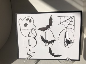 I used white card stock and stamped several Halloween images.  I then used dies to cut out the letters BOO on the stamped cardstock and then again two more times on plain white paper.  I glued all of the letters together and added dimensionals to each of the letters to give the letters some height.