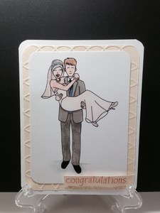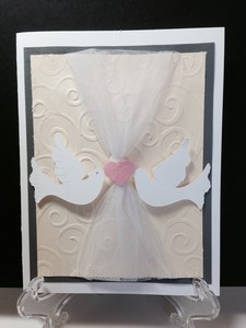 My niece will be getting married this weekend so I made two different cards, I think I will go with the love doves for the two of them. The first card I have the groom carrying the bride over the threshold. You can’t see all the sparkle on this card but its there on her headdress and shoes. The next one is much more simple card. Two love birds holding a heart on a swirled embossed background. Both cards have the same saying on the inside, congrats to the new Mr. and Mrs.