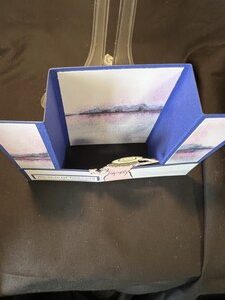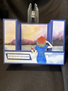 I made two of these cards one with the girl in a pink dress and the other with the girl in a blue dress. Both of these cards used designer paper from Stampin Up called New Horizons and the girls were colored using markers. I made both of these cards with the sentiment of, “Thinking of You, ” that way it can be used in a variety ways anywhere from just thinking of you to condolences to hey what are you up to. The girl is looking out and the water and thinking. There is plenty of room on the back to write your message and these cards fold up and fit into an A2 envelope.