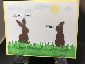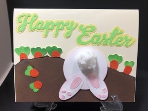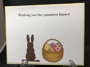I made these two cards to be more Spring like then Easter but they did turn out cute. The first shows the bunny going into his hole after eating the carrots from the farmer’s garden. The next one shows the chocolate bunny ears and butt being eaten and they can’t hear.