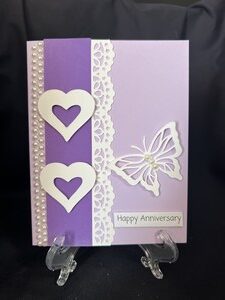 I die cut a white butterfly and two hearts and mounted the hearts on a dark purple card stock and the butterfly on the card base of light purple. Along one edge I added two rows of pearls and then I paper punched a lacy border to add along the other edge of the dark purple strip.