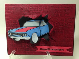 Time out from Thanksgiving cards, although this one was made for my daughter’s boyfriend and his birthday is Thanksgiving day this year. He loves El Camino cars. I Googled the image and colored it with copic markers. I then ran the red cardstock through a brick embossing folder and touched just the top of the bricks with black ink. I backed the red cardstock with black and cut several slits in both papers. To keep the curl in the paper I wet the edges of the cardstock and curled them around a pencil. Looks complicated but really isn’t once you break it down into steps.