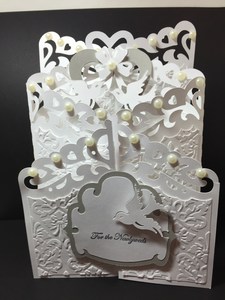 Ahhh love is in the air… As a celebration of my son being in a wedding party for one of his friends I thought I would make this card for their wedding. It was not to hard to make, although it looks very hard. I embossed several of the panels and just glued them on top of the base. There is also several doves on the card that I used dimensionals to raise them up. If I make this one again I plan on using smaller pearls. There is plenty of space on the back for writing a message to the couple and best of all it folds flat in and envelope.