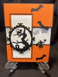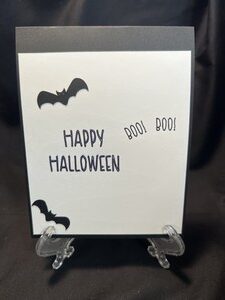 This is a card where part of the message is hidden underneath the flap of the card. The part behind the tree has glow in the dark paper to give a spooky look to the card. The hidden portion are the bats and the Happy Halloween message. Kids will love to take this card into the dark just to see it glow.