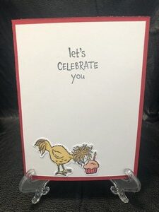 Sometimes its just fun to be silly and this card really fits the bill. I first stamped a little chick for the background and then stamped and cut out the big chicken with a balloon around her feet. I colored the chicken with alcohol markers and die cut the Happy Birthday out three times and stacked them on top of each other. For the inside I stamped lets celebrate you and a chicken eating a cupcake.