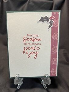 For the inside I added a piece of the patterned paper along the side with a snip of holly and then the sentiment of “May this season be filled with peace and joy.”