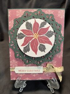 I first stamped the poinsettia in a circle and mounted it on top of a green doily.  I used red patterned paper as the background and added a gold ribbon at the bottom with the sentiment of “Merry Christmas.”