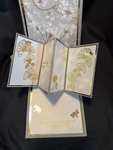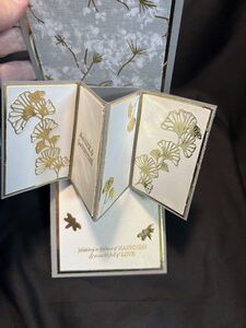 I stamped the crane and then embossed it with gold embossing powder.  For the inside I die cut some leaves and dragonflies then added some designer paper for the background.  I then stamped and sentiment on the bottom inside and used embossing powder to finish the card off.