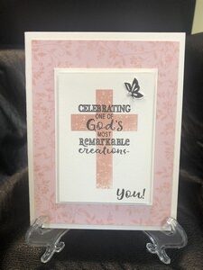 I saw this card on Pinterest and thought I would give it a try. I used pink ink and stamped it on pink cardstock for the background. For the sentiment I used black ink and popped up the sentiment up on white cardstock. The cross was stamped with the same pink ink and the butterfly was stamped with black ink and then fussy cut. I added a small pearl to the butterflies body.