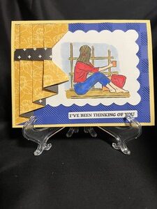 This card is called a curtain card because of the way the paper on the side is folded into looking like a curtain. I first embossed some blue paper and then die cut the scallop rectangle. I then stamped the girl sitting and looking outside and colored her with markers.