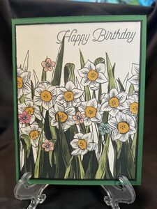 I used a deep green card stock for my base and then added a skinny black one and on top I added the daffodil design.  You can’t really see it but I used Wink a Stella on the daffodils to give it a little shine.