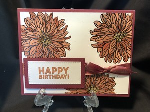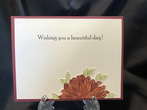 I made both of these cards as birthdays. I think they would look great as Thinking of you, Get Well or even a Sympathy card. For this first one I used shades of orange and red markers to give it that varied look. A simple burgundy bow on the side and its all finished. On the inside I added another dahlia just peeking from the bottom of the card.