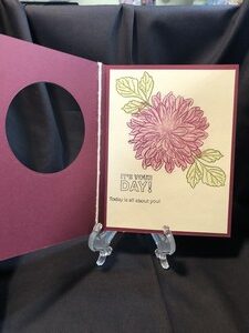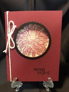 I made both of these cards as birthdays. I think they would look great as Thinking of you, Get Well or even a Sympathy card. For this first one I used shades of orange and red markers to give it that varied look. A simple burgundy bow on the side and its all finished. On the inside I added another dahlia just peeking from the bottom of the card.