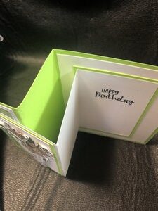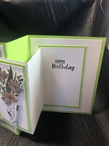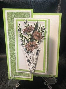 This is a very nice card to give to someone who may be ill or for a birthday or anything in between. For this card I made it into a birthday card. I used shades of green and colored in the flowers with pink watercolor pencils and green for the leaves. On the left side I used some designer paper for an extra dash of color.