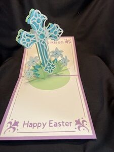 Happy Easter everyone! For my final Easter card I made this pop up cross card. the colors I used for the card stock are white blue purple and green. The front has a die cut cross on it but as you open the card a pop up cross appears. There are white lilies at the bottom of the cross. The middle picture shows the top view and the last photo shows how it looks when fully opened.