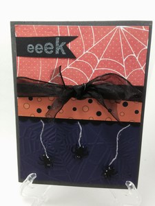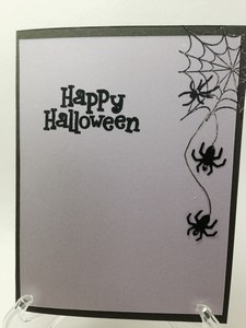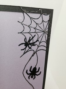 I really hate spiders, but I don’t mind making cards with them on it. Here is a card with some dangling spiders. On the inside I added some more spiders and tried to make the web glittery I hope you can see it in the close up shot.