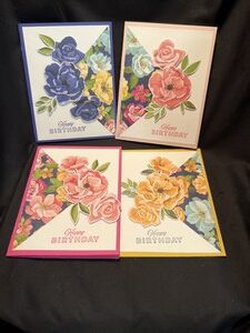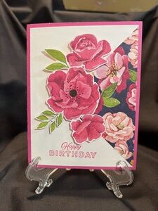 I first cut a quarter triangle of card stock and attached it to a white base. The next step was to cut out flowers from card stock and then layer them starting at the triangle tip and work your way out. I popped everything up on dimensionals and stamped Happy Birthday on the front and added a sentiment on the inside.