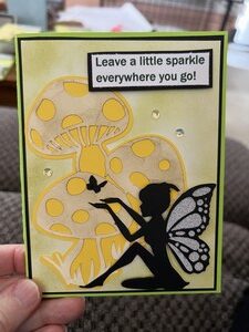 I made this card for my card group. Each month we have a theme and then come up with a new card and this is what I came up with. I used a die cut fairy and made her wings with glitter card stock. I die cut and colored the mushrooms to make them look magical. The sentiment can be used for any occasion.