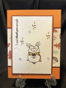 I used mustard and raspberry colored cardstock to back the piggy and the paper with leaves. Nice fall kinda card. There is a small banner to the left with a sentiment of thanks and a sentiment on the inside as well.