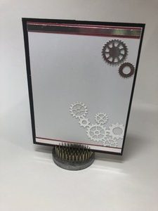 I die cut gears out of silver foil paper and then added a few more to the inside. Cut out the car and popped it up on dimensionals. I added a little smoke around the car to show that it was running.