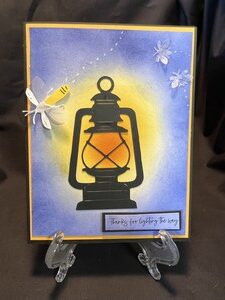 These fireflies are flying around a lantern. I die cut the smaller ones out of vellum and the larger one has wings of vellum. I sponged blue ink around the background and yellow around the lantern. I then die cut the lantern and added it on top of the yellow so that it looks like it is glowing. A very nice an easy card for the holiday weekend.
