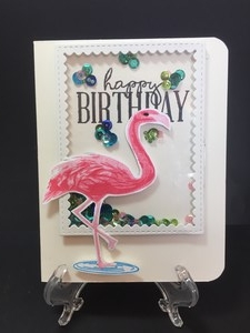 Who doesn’t love to shake something on their birthday. Well why not make it a birthday card. This cute card was created using sequins and mini beads while the flamingo looks on.