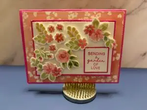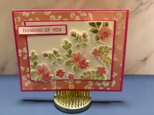 These cards are called floating frames because, they look like they are floating in the air. The real secret is the dimensionals under each flower to give it the lift. For these cards I used Stampin Ups washi tape on white card stock. I stamped a simple sentiment on the front and left the inside blank until I am ready to use them.
