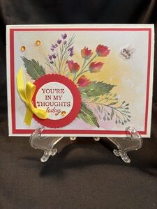 This card was created with some of the Paper Pumpkin kit of September 2022. I cut one of the cards in half and used it for the front of the card. I then die cut a scallop circle and a regular circle which I used to stamp a sentiment on. After attaching the circles I added a yellow bow and a few sequins and one lone bubble bee. I left the inside blank so that a personal message could be written.