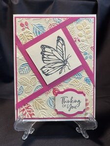 I then stamped a butterfly for the focal point and then did the fractured part of the card. To achieve this you need to cut a quarter inch of card stock and line it at the corner of the focal point and allow it to go to the end of the card. You continue around each of the corners and the final result will look like a fractured paper.