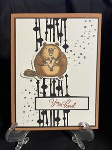 I stamped, colored then cut out the beaver and the black circle lines and placed them on a white card base.  I then stamped little dots to show some movement and then stamped the sentiment you are loved. The inside is left blank so that it could be used for any reason.